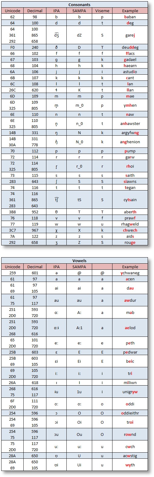 The charts below represent the full set of IPA and X-SAMPA phonemes accepted by Capacity Private Cloud (TTS1) Text-To-Speech Welsh (cy-GB) associated with the following voices: