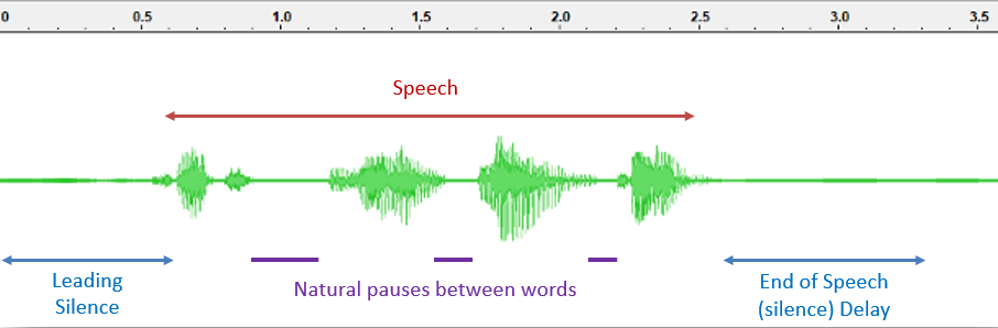 As can be seen in this diagram, the purple periods of silence are normal and expected within natural speech. The End of Speech (Silence) Delay (VAD_EOS_DELAY) is used to check whether silence is one of these gaps between words, or if the person has finished speaking, at which point a result can be generated.