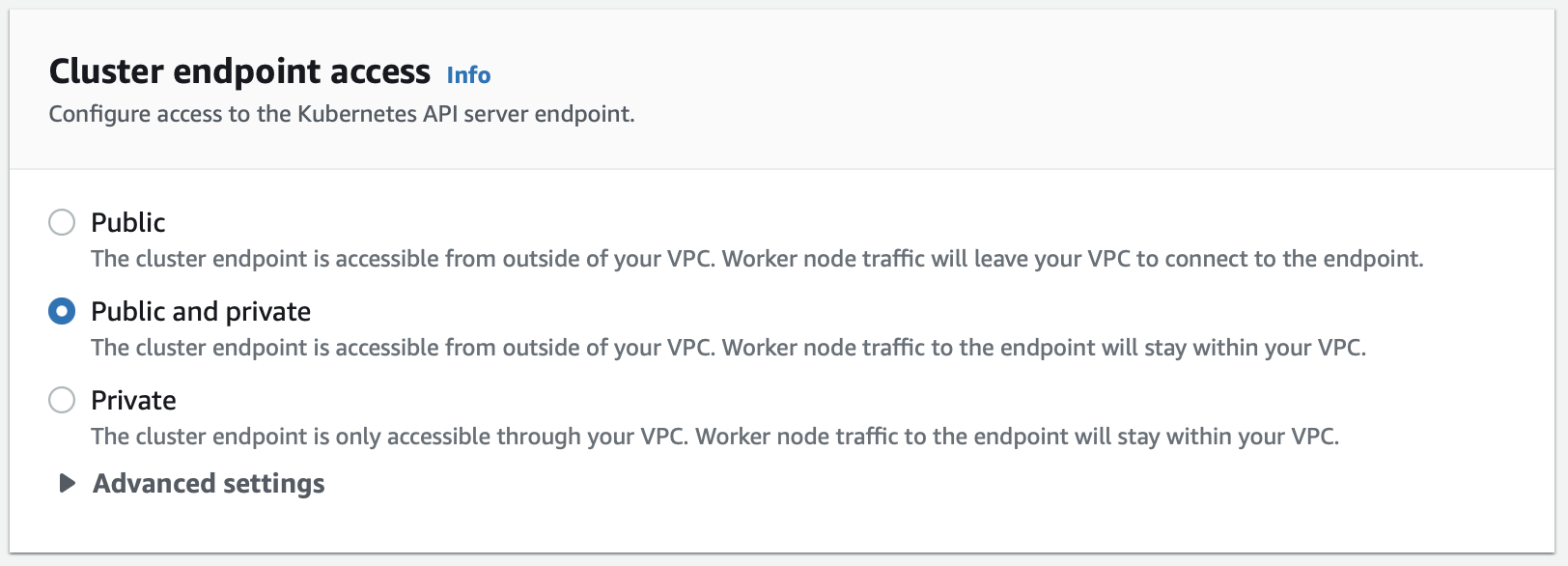 Configure the cluster endpoint access settings. The recommended defaults provide a balance between accessibility and security. Adjust based on your organization's network policies.