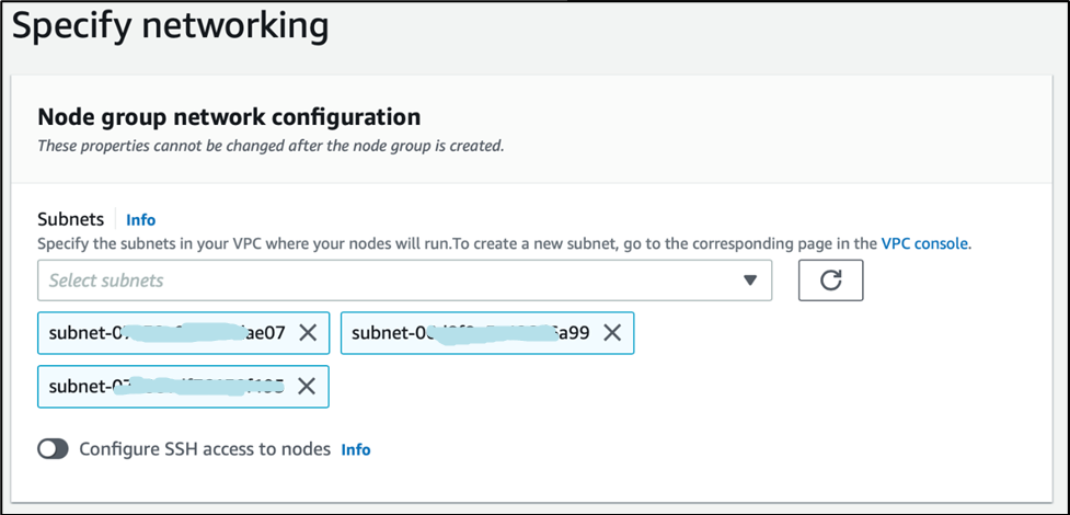 Configure networking for the node group. Review and click Create. Node group creation can take several minutes. Monitor for any errors.