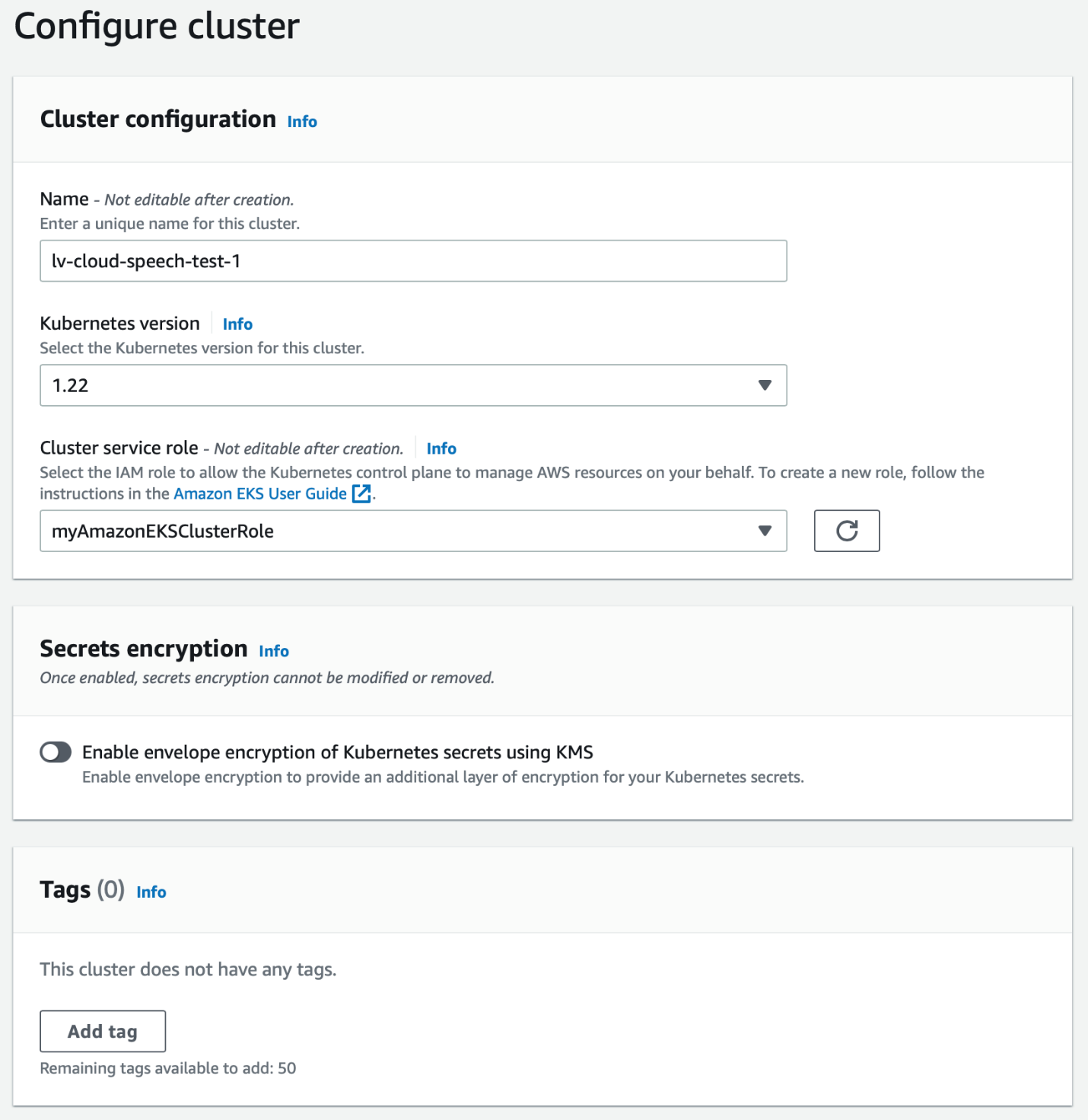 Begin by creating a new EKS cluster in the AWS Management Console. Provide a cluster name and configure networking options (e.g., whether the cluster will be publicly accessible). Kubernetes version 1.33 is currently recommended. Refer to the lumenvox/helm-charts GitHub repository for the latest minimum version requirements.