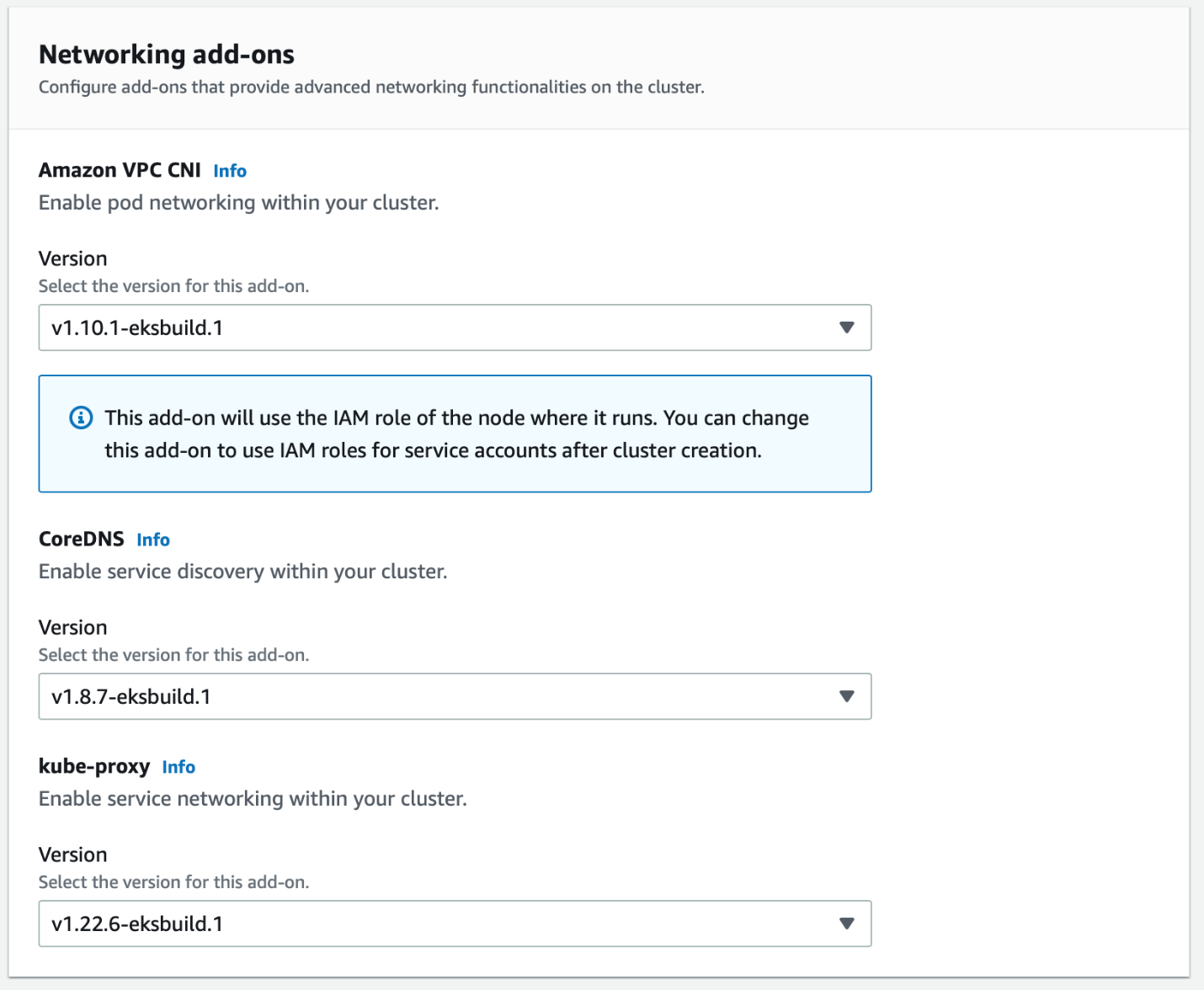 Review and accept the recommended networking add-on settings. These provide the core networking capabilities required by the cluster.