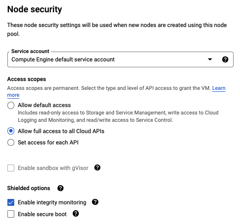 Review the default security settings for your node pool. The defaults are generally suitable, but should be adjusted based on your organization's security policies and requirements.