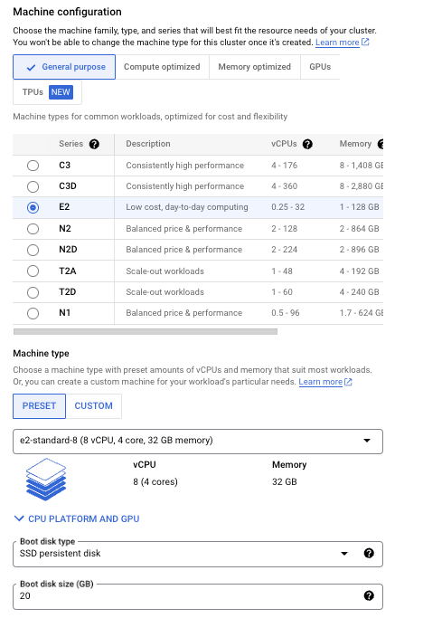 Select the operating system and machine type for your nodes. The recommended minimum is 8 vCPUs and 32 GB memory per node. Choose the operating system that best suits your operational requirements.