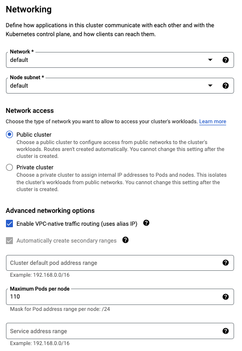 Configure networking for the node pool. A public cluster network is recommended for simplicity, though private clusters are supported if your security requirements demand them. Adjust settings as needed for your environment.