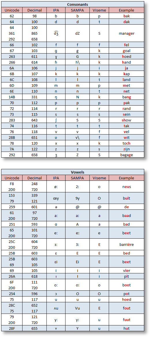 The charts below represent the full set of IPA and X-SAMPA phonemes accepted by Capacity Private Cloud (TTS1) Text-To-Speech Dutch (nl-NL) associated with the following voices: